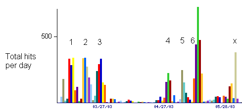 The time sequence of numbers of hits on the course site per day below shows three course weeks (1-3), the Easter holiday, then three further course weeks (4-6). The higher peak in week 6 is due to data needed for the final practical being provided through Blackboard. The examination period then followed immediately, with a peak of hits on the day before the Ecosystems and Ecophysiology paper (x). Most hits were made from Mondays to Wednesdays during the course weeks; these were the lecture days, with practicals on Thursdays: