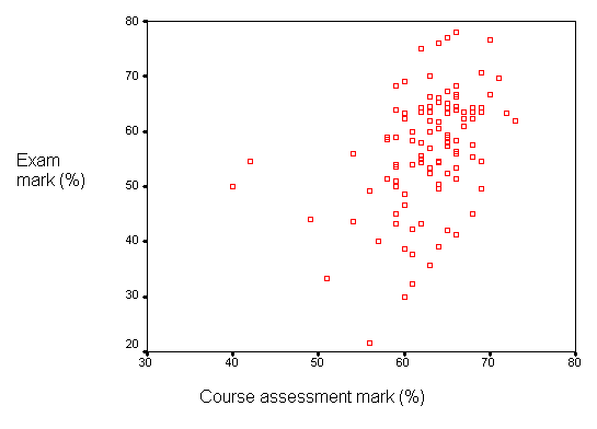 There was no correlation between the number of hits and the student's examination mark (rs=0.02, P=0.85). There was also no correlation between the number of hits and the student's final mark (rs=0.07, P=0.45), which was made up of 40% course assessment and 60% examination results. Course notes were, however, given on the School of Biological Sciences web site, not on Blackboard, so use of these notes was not reflected in the analysis. There was a weak correlation between students' examination and course assessment marks (rs=0.44, P<0.001):