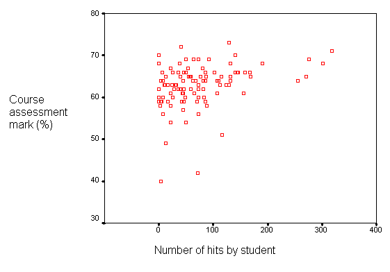 There was a weak correlation between the number of hits and the student's course assessment mark. Spearman rank correlation rs=0.34, P<0.001: